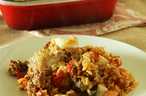 Paella with Chicken, Spicy Italian Sausage, and Shrimp