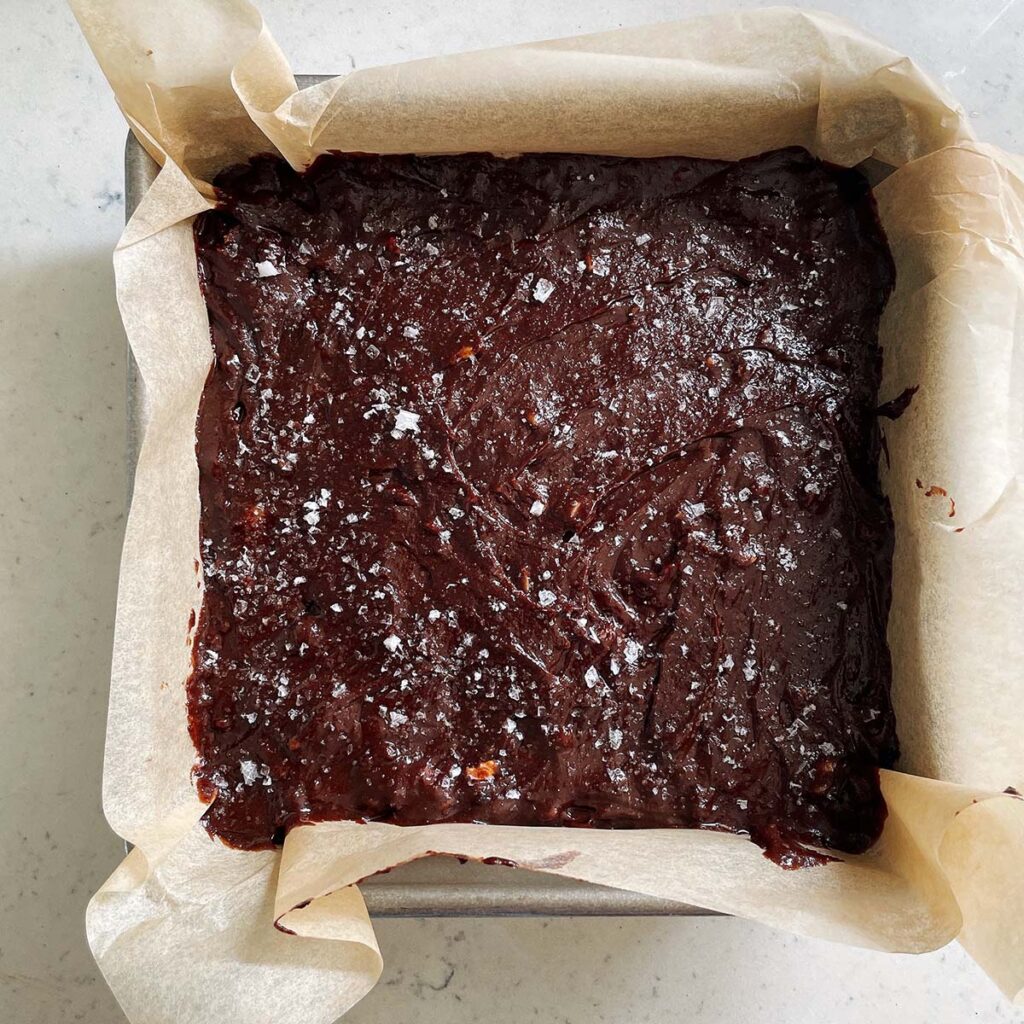 - Scrape the batter into the prepared pan and smooth the top. Sprinkle with the 1/2 tsp of flaky sea salt. Bake for 20-25 minutes until a wooden skewer comes out clean with only a few moist crumbs attached.
