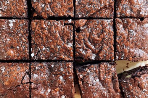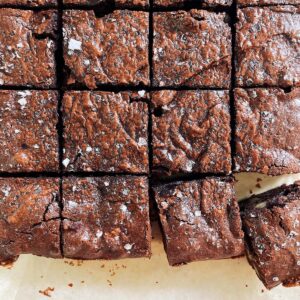 Brownies are always a good idea. Decadent, rich, chocolatey squares of joy! While there is much debate out there about what makes the perfect brownie – some like them super rich and fudgey, some people like them more cakey, some people don’t like nuts – there is a version out there for everyone. For me, I like them to be in a goldilocks zone between fudgey and cakey, and I love the texture introduced by adding chopped nuts. And last but not least, I like them with a good sprinkle of flaky sea salt – like a salted dark chocolate bar but in brownie form.